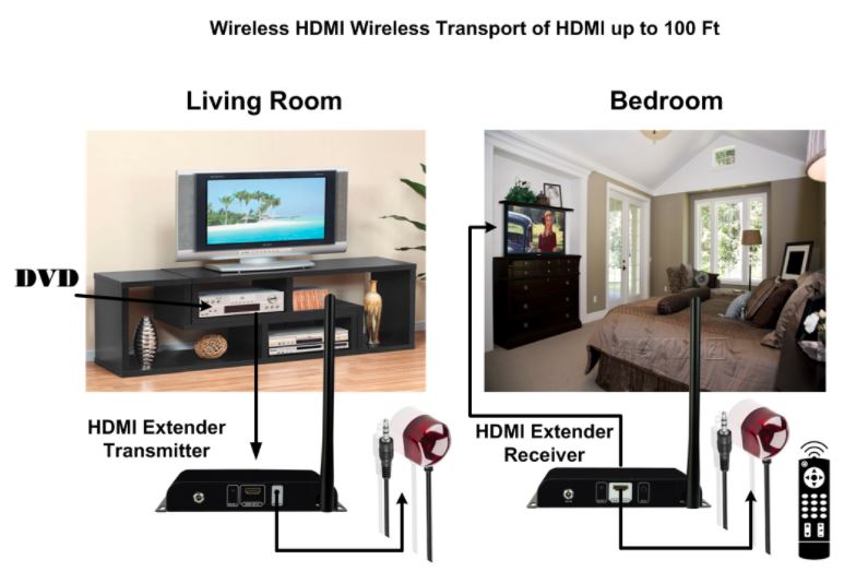 The HDMI-RF-PC units transport the HD Video signal over unlicensed bands using a minimal compression proprietary codec. Since there is little compression, the latency is less than 100 ms. The unit operates in the license free 5 GHz band, and therefore has much better wall penetration ability than similar units that use the 60 GHz band. Other 5 GHz solutions use MPEG encoding to reduce the bandwidth, this is a much lower compressed and high data rate signal. Without the need to for complete encoding, the latency is dramatically reduced.